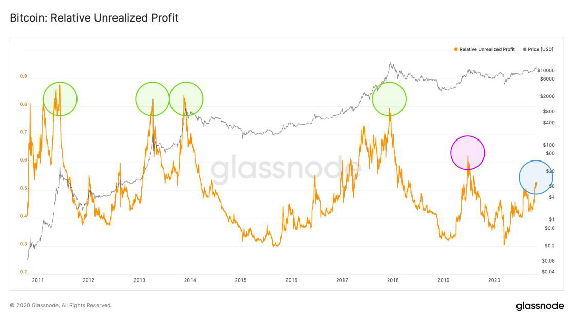 Ma c’è un altro parametro che aiuta a comprendere il sempre maggior interesse verso il Bitcoin: il Bitcoin’s Relative Unrealized Profit, che misura il numero totale di Bitcoin comprati al di sotto del prezzo attuale. Questi bitcoin possono essere considerati come profitti non realizzati da parte degli investitori che li detengono. Negli ultimi sei anni, ogni volta che questa metrica ha raggiunto l’80% di tutti i Bitcoin da cui non si è tratto profitto, sono stati registrati ampi sell off, come mostrato dal grafico. Le eccezioni a questa regola sono costituite da casi particolari, come il crollo di mercato avvenuto a metà marzo a causa della pandemia. Al prezzo attuale, questo indicatore mostra come il 56% di tutti i detentori di Bitcoin non abbiano al momento operato prese di beneficio, il che ci dice che c’è ancora ampio spazio di crescita nei prossimi mesi, soprattutto dopo l’annuncio promettente di Pfizer e Biontech sul loro vaccino per il COVID-19.