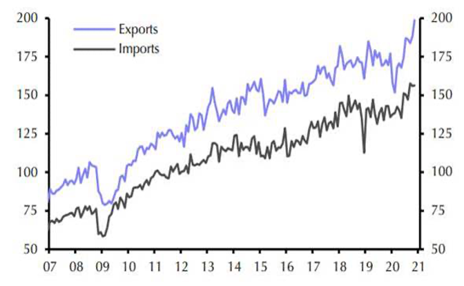 Questa sorprendente accelerazione delle esportazioni osservata nel 2020 – rappresentata nel grafico sottostante – non può durare per sempre, soprattutto perché i vaccini COVID saranno resi disponibili l’anno prossimo e la situazione mondiale, si spera, tornerà stabile.