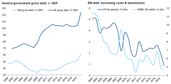 La pandemia ha colpito i bilanci dei mercati emergenti, ma meno di quanto abbia fatto con quelli delle economie più sviluppate. Il Fondo Monetario Internazionale prevede che il debito pubblico delle economie emergent crescerà quest’anno del 9,2% del Pil, attestandosi al 61,4%. Nei mercati sviluppati invece il debito crescerà del 20%, arrivando a quota 124% del Pil; più del doppio rispetto ai mercati emergenti, sia in termini relativi che assoluti. Questo dato indica un impatto minore sulle finanze degli EM, in cui si prevede un deficit primario dell’8,5% del Pil per il 2020, vale a dire un +5,5% rispetto al 2019. Al contrario, nei mercati sviluppati si prevede un disavanzo primario del 13% del Pil, con un +11% rispetto all’anno scorso.