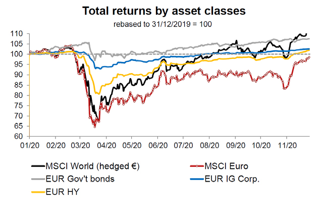 Abbiamo affrontato il mese di novembre con una prudente sovraesposizione agli asset rischiosi, nonostante le preoccupazioni per le nuove chiusure dettate dal Covid, i contagi in aumento in Europa e le incertezze dettate dalle elezioni USA. Alla fine di novembre l’indice MSCI World ha guadagnato un sorprendente 13,6% (al 27 novembre 2020), registrando la migliore performance degli ultimi quarantacinque anni!