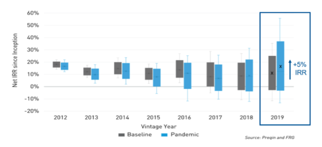 Tra i principal trend innanzitutto quello relativo al distressed debt. La pandemia ha avuto un impatto sulle società di qualità, duramente colpite dal distanziamento sociale. Queste società potrebbero aver bisogno di un supporto in termini di liquidità nel breve termine, che non viene fornito dalle banche. Secondo uno studio di Intertrust Group, il mercato del debito in sofferenza, attualmente stimato in 600 miliardi di dollari, dovrebbe crescere e diventare il tema più importante nel breve termine. Un’altra serie di opportunità consiste nei trarre vantaggio dai trend strutturali che di solito accelerano dopo un grande shock. Vediamo tali tendenze nei settori della sostenibilità, della digitalizzazione e della sanità pubblica. Come stimato da Preqin e IJGlobal, l’energia rinnovabile era già il settore delle infrastrutture più attivo nel 2019, con la tecnologia e la sanità che rappresentavano rispettivamente il 19% e il 13% delle operazioni di private equity, e nella fase post-Covid si prevede una loro accelerazione. Infine le opportunità legate alla cosiddetta market disruption: i periodi di perturbazione del mercato possono creare opportunità interessanti e alcuni fondi lanciati dopo una crisi hanno generato rendimenti particolarmente interessanti. Come mostrato nel grafico sottostante, in base ai dati di Preqin e FRG, le aspettative di tasso interno di rendimento (IRR) sono aumentate del 5% per i fondi lanciati nel 2019, in quanto investiranno dopo il periodo di recente perturbazione del mercato