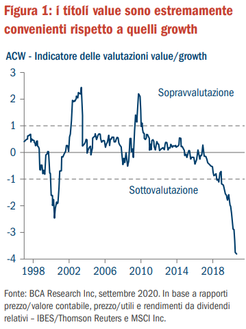 Il prolungato periodo di tassi bassi consente di tracciare qualche parallelo con l’epoca delle “Nifty Fifty”, il periodo a cavallo tra gli anni ’60 e ’70 durante il quale 50 titoli growth dominarono le performance del mercato azionario statunitense. Ciononostante, se pure i rendimenti obbligazionari si limitassero a stabilizzarsi anziché salire, verrebbe rimosso un ostacolo significativo per le banche. La convenienza dei titoli value rispetto a quelli growth ha raggiunto il massimo storico, superando persino quella rilevata all’apice della bolla delle dotcom del 2000 (Figura 1). Tuttavia, queste azioni hanno bisogno di un elemento catalizzatore in grado di innescare una ripresa. Un nuovo pacchetto fiscale e un vaccino regolarmente autorizzato e distribuito in tempi rapidi potrebbero fornire questa spinta, ma non siamo ancora giunti a questo punto. Sono diversi i candidati vaccini giunti ai test di fase 3, di cui tre sembrano essere efficaci. Tuttavia, l’approvazione definitiva, la produzione e la distribuzione globale richiederanno altro tempo.