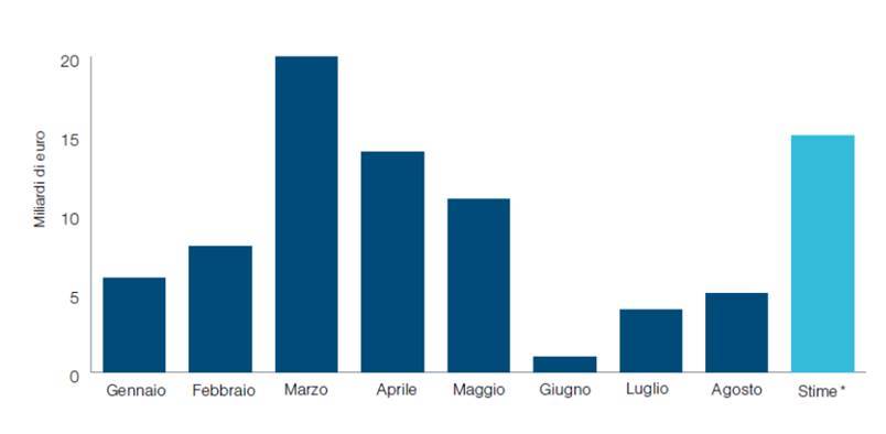 Al 30 settembre 2020, a livello globale, erano 56 gli emittenti che avevano abbandonato l’universo investment-grade, per un controvalore complessivo di 216 miliardi di dollari di debito. Di questi, secondo i dati di Credit Suisse, 69 miliardi facevano capo all’Europa, dove però il ritmo dei downgrade era in netto calo da metà anno (Grafico 1).