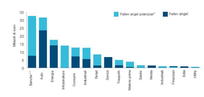 Un potenziale candidato a diventare un ‘angelo caduto’ è Deutsche Bank, che attualmente ha una parte del suo debito subordinato giudicato al limite dell’investment grande, con rating Baa3/BBB-. L’istituto di credito tedesco ha beneficiato di una tregua all’inizio di novembre da parte di Moody’s (che ha rivisto l’outlook da negativo a stabile) in seguito alla pubblicazione dei suoi risultati trimestrali. Secondo le nostre stime, il declassamento di un grado di Deutsche Bank farebbe crescere di altri 19 miliardi il debito high yield.