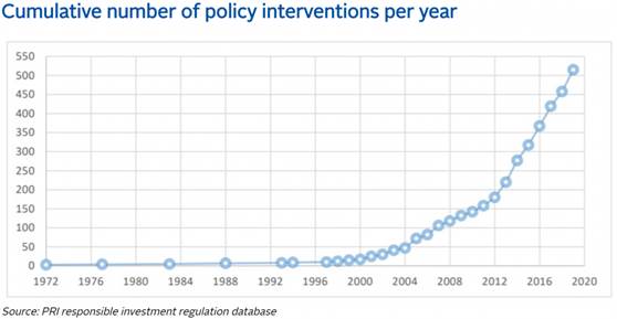 Con l’arrivo della pandemia e della recessione, il 2020 avrebbe potuto portare con sé un rallentamento degli investimenti sostenibili da parte delle aziende e dei governi che necessitano di far fronte a nuove emergenze e priorità. Tuttavia, anche in questa situazione imprevedibile, abbiamo assistito a una continua e inesorabile spinta verso la transizione ecologica, un processo a detta di alcuni, ancora non sufficientemente profondo per ridurre i rischi, ma ormai in moto. Questo fatto emerge chiaramente analizzando le attività degli attori coinvolti a vario titolo nella transizione verso un modello economico più sostenibile. Nel 2020 governi e regolatori hanno continuato a prendere azioni decisive per ridurre il riscaldamento globale, spesso nell’ambito dell’accordo di Parigi. Sul fronte investimenti abbiamo visto sviluppi importanti della EU Taxonomy, un protocollo che mira a standardizzare la disclosure e a facilitare la due diligence di investimenti sostenibili. La Cina, il maggior consumatore di risorse energetiche fossili al mondo, ha annunciato a sorpresa di voler diventare Carbon neutral entro il 2060, cominciando a ridurre le proprie emissioni già a partire dal 2030. Il grafico mostra la crescita esponenziale delle revisioni delle politiche su tematiche ambientali dal 1972. Una traiettoria che non che non si è inclinata neppure di fronte alla pandemia.