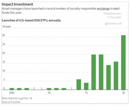 Per gli investitori il 2020 ha rappresentato un anno record per l’aumento di masse di prodotti sostenibili, raccogliendo, secondo le stime dell’Investment Association, 7 triliardi di dollari nei primi 3 trimestri del 2020, più che triplicando i 1.9 triliardi del 2019. Il flusso dei capitali verso le aziende più virtuose e resistenti a rischi ambientali è un trend in forte crescita che sembra praticamente inarrestabile, anche a causa dello sviluppo della regolamentazione.