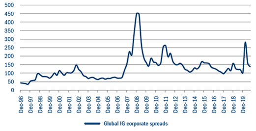 Gli spread IG a livello mondiale si attestano a 130 pb al di sopra dei titoli di Stato, in linea con la media di lungo periodo (cfr. Figura 1). I livelli di rendimento delle obbligazioni sovrane e i tassi sulla liquidità, invece, sono ai minimi storici, mentre i P/E delle azioni segnano livelli massimi da due decenni in ragione dei tassi di sconto estremamente bassi. In tale contesto, un attivo intorno alle valutazioni medie a lungo termine è da considerarsi interessante.