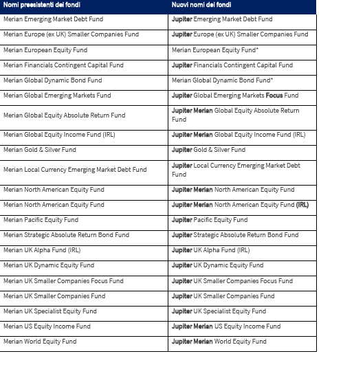 Mentre la maggior parte dei fondi passerà al prefisso Jupiter, la gamma di fondi Merian Systematic Equity, guidata da Ian Heslop e Amadeo Alentorn, sarà ora rinominata in “Jupiter Merian”, il che significa, per esempio, che il Merian North American Equity Fund diventerà il Jupiter Merian North American Equity Fund.