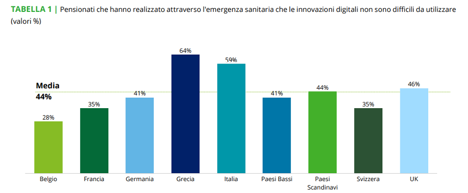 Uno dei dati più interessanti che emerge dallo studio di Deloitte è l’effetto che la pandemia ha avuto sulla popolazione anziana. Per la prima volta nella propria vita, ben il 44% dei pensionati europei ha realizzato che le innovazioni digitali non sono così difficili da utilizzare. Un dato che raggiunge picchi significativi in Grecia (64%) e Italia (59%), dove la quota di popolazione anziana è molto rilevante. Costretti all’isolamento e spaventati dal contagio, le persone più anziane per la prima volta hanno superato la propria diffidenza nell’utilizzo della tecnologia, utilizzando app e servizi digitali come la telemedicina, lo shopping on-line e gli strumenti per comunicare a distanza con i propri cari.