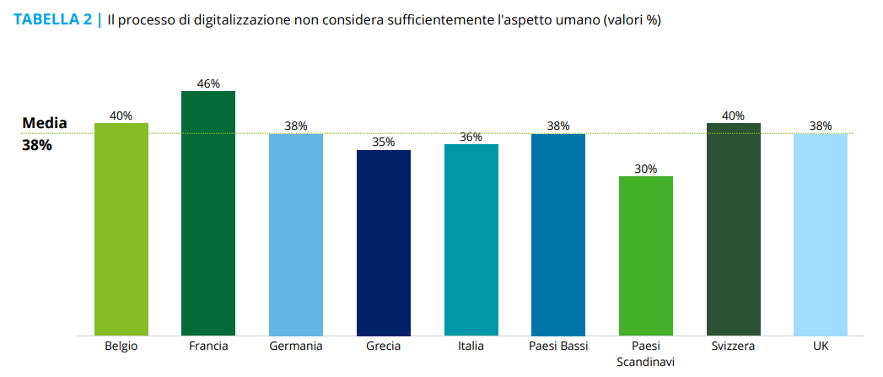 L’emergenza sanitaria ha anche messo in luce anche alcune lacune infrastrutturali che ostacolano il corretto funzionamento delle tecnologie a disposizione. Ad esempio, circa 2 rispondenti su 5 denunciano la difficoltà ad accedere ai servizi scolastici erogati tramite piattaforme di e-learning così come la mancanza di condivisione di dati sanitari tra strutture. Ma, al di là dei limiti infrastrutturali, ciò che emerge è che il processo di digitalizzazione non consideri abbastanza l’aspetto umano. A pensarla così il 36% degli italiani, in linea con la media europea del 38%. Ma ci sono paesi dove il problema è ancor più sentito, come la Francia, dove quasi la metà dei rispondenti (46%) lamentano tale carenza.