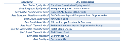 MainStreet Partners, specialista in ESG Advisory e Portfolio Analytics dal 2008, ha lanciato quest’anno la prima edizione dell’“ESG Champions”, premio ideato con l’obiettivo di selezionare i “campioni” della sostenibilità tra 350 strategie gestite da oltre 60 asset manager internazionali, che il team di MainStreet ha valutato sulla base di una metodologia di rating proprietario. MainStreet ha identificato 11 categorie di vincitori, 9 comprendenti i migliori fondi sostenibili nei comparti Equity, Fixed Income, Multi-Asset e Tematico e 2 relative al “Miglior Asset Manager” e alla “Miglior Boutique di Investimento”: