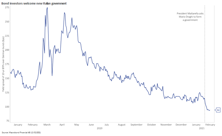 Draghi è l’uomo giusto nel posto giusto al momento giusto per fare il massimo per l’Italia in una fase cruciale per le opportunità del Next Generation EU e del Recovery Fund. Speriamo che il nuovo governo colga questa opportunità per l’Italia e l’Europa. Molte di queste speranze sono già riflesse nei prezzi e il focus ora è sui risultati.