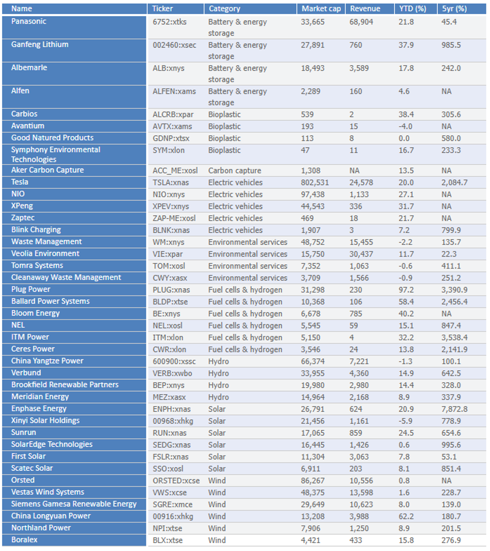 La seguente tabella mostra 40 titoli con esposizione a una serie di categorie legate a questo tema e che fanno parte di diversi settori che comprendono attività quali: produzione di batterie, stoccaggio di energia, produzione di bioplastica, cattura del carbonio, servizi ambientali, produzione di celle a combustibile e idrogeno, produzione di energia solare ed eolica.