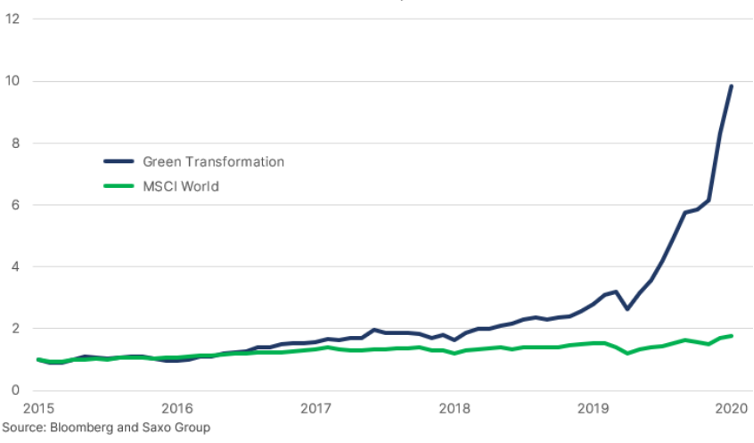 Quello della Green Transformation è stato uno dei temi che ha riscontrato più successo sui mercati azionari lo scorso anno e anche la sua performance year-to-date è stata tra le migliori in confronto ad altre categorie azionarie, cosa che sottolinea l’elevata attenzione verso le azioni Green. Tuttavia, tale successo si sta rivelando anche un limite per quanto riguarda la valutazione di queste azioni, che incorporano un premio in confronto al resto del mercato azionario.