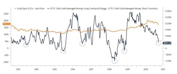 Queste osservazioni sono ulteriormente supportate dal posizionamento rialzista nei mercati dei futures, dove le posizioni lunghe nel risparmio gestito (una delle categorie nei futures che meglio rappresenta gli speculatori) sono a livelli storicamente bassi.