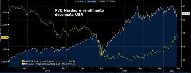 È infine utile ricordare come quest’avvio incerto del Nasdaq potrebbe essere il sintomo di una crescente consapevolezza tra gli analisti degli eccessi valutativi di questa parte del mercato azionario americano. Il 2020 è stato l’anno in cui il rapporto tra l’indice Nasdaq e l’indice S&P (rappresentativo del mercato nel suo insieme) ha superato i massimi del 2000, in concomitanza con quella che fu definita come “bolla delle dot-com”. Anche l’interesse diffuso per la Borsa tra i non addetti ai lavori e l’attività sul mercato primario fanno pensare proprio a quegli anni. Oltre alla valutazione di alcune importanti IPO, segnaliamo la fervente attività delle cosiddette SPAC, che permettono alle società di quotarsi con un livello di trasparenza ben inferiore da quanto previsto per il tradizionale processo di IPO. Proprio il posizionamento estremo del mercato a favore dei titoli growth potrebbe ulteriormente favorire un altrettanto robusto recupero dei titoli cosiddetti “value” in un contesto macroeconomico caratterizzato da una dinamica di ripresa dell’economia.