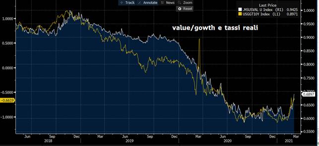 Il rialzo del rendimento del decennale americano è dovuto ad un cambio di scenario macroeconomico. Grazie alla scoperta dei vaccini e a politiche monetarie e fiscali senza precedenti, gli operatori si attendono una robusta ripresa dell’economia a stelle e strisce. Segnaliamo in particolare come, da inizio anno, i tassi reali a 10 anni abbiano iniziato a muoversi al rialzo, seppur partendo da minimi storici e rimanendo sempre in territorio fortemente negativo (da circa -1% a -0.7%). Nel grafico sottostante evidenziamo come un recupero dei tassi reali coincida con una sovraperformance dello stile di gestione “value” a scapito dello stile di gestione “growth”. Anche in questo caso, nel corso del 2019 e del 2020, lo stile growth è prevalso grazie alla forte discesa dei tassi reali, ma nei primi mesi del 2021 questo trend si è invertito favorendo il recupero del value a fronte di una ancorché minima ripresa dei tassi reali.