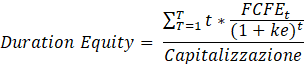 Come si vede dalla formula, quindi, si legano i flussi di cassa futuri dell’azienda (FCFE), al costo del capitale (ke) e alla capitalizzazione di mercato attuale. Il risultato di questa formula è un numero che esprime, proprio come nell’ambito bond, una misura temporale di remunerazione dell’investimento fatto. Un modo più semplice per calcolare l’Equity duration, è derivato implicitamente da un altro famoso modello di valutazione: il Dividend Discount Model. In questo caso si va a legare il costo del capitale con il tasso di crescita di lungo periodo (g), saltando tutta la derivazione intermedia, abbiamo che: