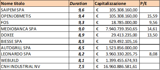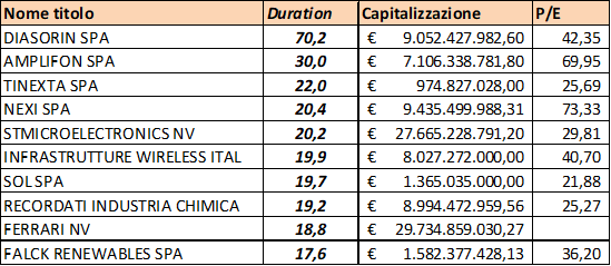 Partendo dalla breve premessa teorica fatta, abbiamo provato a calare questa analisi nel contesto dei titoli quotati italiani. L’universo di investimento è quindi tutto il mercato quotato italiano (AIM e MTA), dove sono state eliminate le aziende che non avevano abbastanza dati. Ci sembra interessante calare questa analisi in un contesto pratico, in particolare nel mercato italiano, alla luce dei recenti andamenti macroeconomici. Proprio come nel mondo bond stiamo assistendo a un certo grado di sofferenza per i titoli a duration lunga, così vogliamo cercare gli omologhi in ambito equity e muovere le stesse considerazioni macro. Per definizione, un titolo long duration è quindi sia più sensibile al movimento dei tassi al rialzo, sia più sensibile a notizie inattese come può essere una trimestrale non in linea oppure che non sorprende come ci si aspetta. Abbiamo quindi calcolato l’equity duration con entrambe le formule descritte sopra, riportando un valore medio e ordinando in quartili. Riportiamo di seguito il primo e l’ultimo quartile.