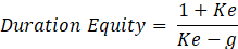 Come si vede dalla formula, quindi, si legano i flussi di cassa futuri dell’azienda (FCFE), al costo del capitale (ke) e alla capitalizzazione di mercato attuale. Il risultato di questa formula è un numero che esprime, proprio come nell’ambito bond, una misura temporale di remunerazione dell’investimento fatto. Un modo più semplice per calcolare l’Equity duration, è derivato implicitamente da un altro famoso modello di valutazione: il Dividend Discount Model. In questo caso si va a legare il costo del capitale con il tasso di crescita di lungo periodo (g), saltando tutta la derivazione intermedia, abbiamo che: