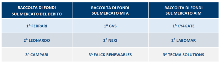Per la categoria “Raccolta di fondi sul mercato AIM” si è classificata al primo posto CY4Gate,società attiva nel mercato cyber a 360° e che rappresenta un progetto industriale unico nel suo genere in Italia ed in Europa, la cui raccolta sarà utilizzata per continuare ad innovare e sviluppare nuovi prodotti, rafforzare la struttura commerciale e accelerare così la crescita. Tra i premiati anche Labomar e Tecma Solutions.