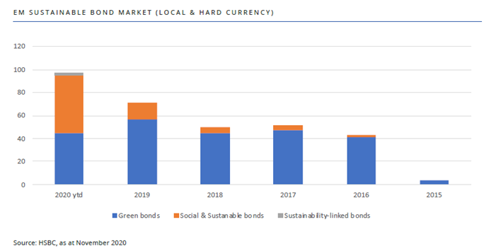 Nel 2020, di tutte le emissioni sovrane e corporate nei Paesi emergenti, sia in valuta forte che locale, quasi 100 miliardi di dollari avrebbero potuto essere classificati come green, social o SLB, sebbene le definizioni e le strutture continuino a variare in base alla tassonomia considerata.