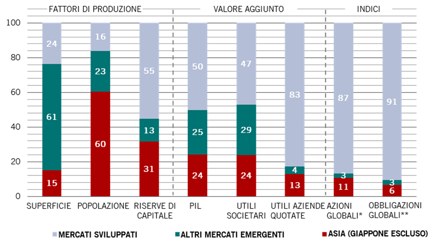 La crescente importanza dell’Asia sulla scena economica mondiale avrà conseguenze di ampia portata per gli investitori, non ultimo perché i mercati finanziari non ne hanno ancora preso atto. Uno sguardo agli indici azionari e obbligazionari mondiali mostra che l’Asia è sorprendentemente sottorappresentata. L’Asia emergente costituisce solo il 10% dell’indice dei mercati azionari globali e solo il 3% di quello obbligazionario, sebbene rappresenti circa il 24% sia dell’economia mondiale, sia degli utili societari globali (si veda la Fig. 1).