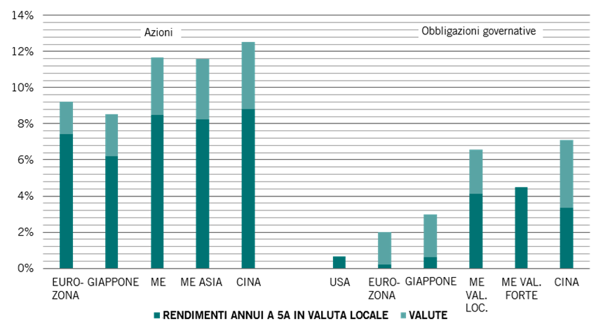 In risposta a questi cambiamenti, i fornitori di indici globali hanno iniziato a inserire più attivi cinesi nei loro indici obbligazionari e azionari. Si tratta di uno sviluppo che dovrebbe generare flussi in entrata combinati per oltre 300 miliardi di dollari nei prossimi anni.[4] Anche le previsioni economiche a breve termine sono solide: ci aspettiamo una crescita del PIL cinese del 9,5% nel 2021. L’India, un altro importante polo asiatico, ha subito una brusca contrazione nel 2020, ma dovrebbe rimbalzare fortemente nel 2021; prevediamo una crescita della sua economia pari al 13,1%. La maggiore crescita dei Paesi asiatici dovrebbe contribuire a incrementare la performance degli attivi della regione nei prossimi anni. Prevediamo che i titoli asiatici emergenti guadagneranno quasi il 12% all’anno nei prossimi cinque anni – quasi il doppio di quelli dei mercati sviluppati. Anche il debito asiatico in valuta locale dovrebbe registrare una solida performance, in particolare in Cina, in un momento in cui chi investe nelle obbligazioni dei mercati sviluppati sta affrontando la prospettiva di perdite di capitale, una volta tenuto conto dell’inflazione (si veda la Fig. 2).