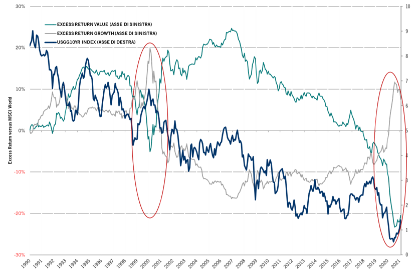Figura 2: Value, Growth eccesso di rendimento storico ed evoluzione dei tassi a 10 anni US dal 1.1.1990 al 28.02.2021.