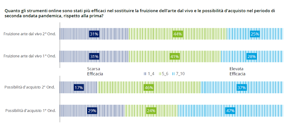 Dai risultati emerge che ciò che è migliorato rispetto alla prima ondata pandemica, è stata sicuramente la digitalizzazione del settore artistico-culturale, soprattutto per quanto riguarda la compravendita. A differenza di quanto rilevato in relazione alla mera fruizione d’arte, sono cresciute significativamente e in senso positivo le risposte relative all’efficacia degli strumenti online nell’acquisto di opere d’arte: l’83% dei rispondenti ha attribuito media (46%) o elevata (37%) efficacia alle piattaforme virtuali. E se la quota di chi ha risposto che gli strumenti e le piattaforme online siano stati molto efficaci è diminuita di 10 punti percentuali, quella di chi ha risposto che l’efficacia è stata media è sostanzialmente raddoppiata. La percentuale di chi ha decretato la scarsa efficacia dei canali e degli strumenti online è diminuita passando dal 29% al 17%. Questo risultato positivo è sicuramente dovuto alla sempre più mirata strategia messa in atto da parte degli operatori di settore per le attività di vendita di opere d’arte e beni da collezione.