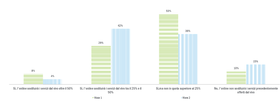 Rispetto ai risultati registrati a settembre, i dati sono rimasti sostanzialmente invariati, seppur l’utilizzo di strumenti online si sia rivelato in leggera diminuzione. Il 62% dei rispondenti (rispetto al 65% dell’edizione precedente) ha utilizzato le piattaforme virtuali per la fruizione dell’arte. E se solo il 4% dei rispondenti sostiene che l’online sostituirà i servizi dal vivo per una quota superiore al 50%, aumentano invece coloro che ritengono che l’online potrà sostituire tra il 25% e il 50% le proposte dal vivo.