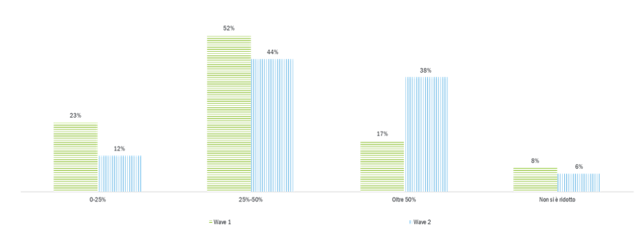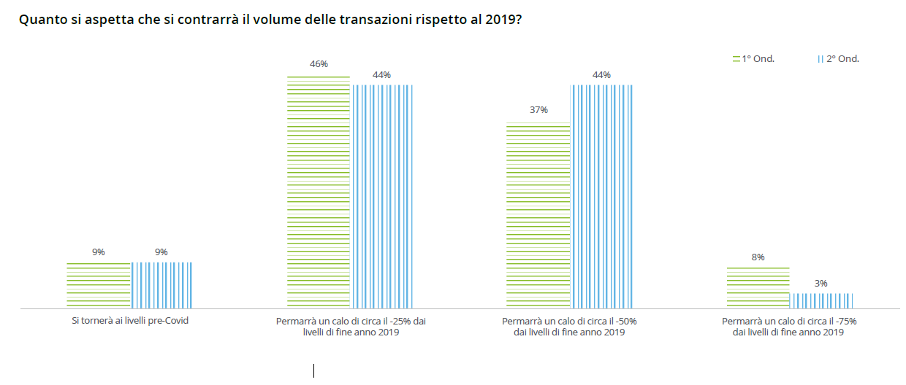 A conferma del fatto che la crescita della digitalizzazione può rimpiazzare solo una parte delle attività dal vivo, c’è il dato che certifica il generale calo nei volumi d’affari. Sono raddoppiati coloro che dichiarano di aver visto ridotto di oltre il 50% il proprio volume di affari rispetto al 2019 (da 17% a 38%), mentre rimane la percentuale più cospicua quella dei rispondenti che ha dichiarato una riduzione del business tra il 25% e il 50%.