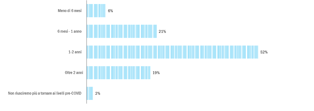Infine, per quanto riguarda le previsioni di ritorno alla normalità, più della metà dei rispondenti, nonostante l’avvio di campagne vaccinali in molti Paesi, ritiene che ci vorranno 1-2 anni, il 19% che ci vorranno oltre 2 anni.