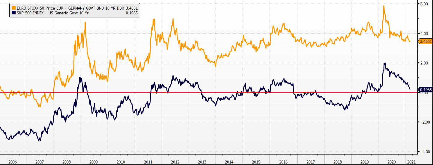 La configurazione attuale è diversa, e i mercati azionari dovrebbero essere in grado di sopportare i tassi a lungo termine statunitensi intorno all’1,5%. In effetti, le azioni hanno sofferto soprattutto quando il tasso dei dividendi è stato inferiore al tasso decennale. Questo lascia spazio per un aumento dei rendimenti statunitensi e un ampio margine per altre aree geografiche (vedi grafico sotto).