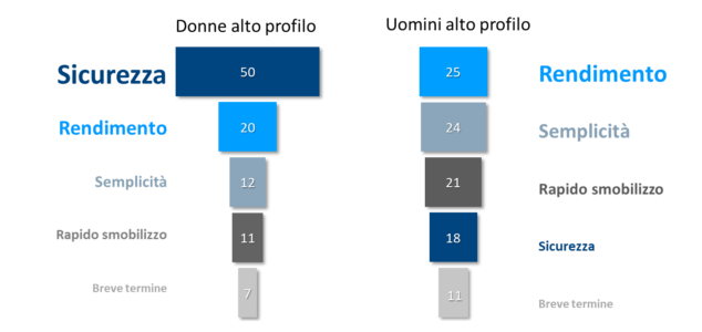 Per le donne di “alto profilo” la sicurezza è un valore che si lega indissolubilmente alla progettualità sul futuro, all’esigenza di pianificare a lungo termine. Per questo motivo tendono ad allocare il 60% delle proprie risorse in progetti di medio-lungo termine e non dovrebbe sorprendere che solo il 4% esprime una propensione a tenere la propria liquidità ferma sul conto in un anno particolarmente critico come il 2020 (contro l’8% degli uomini).