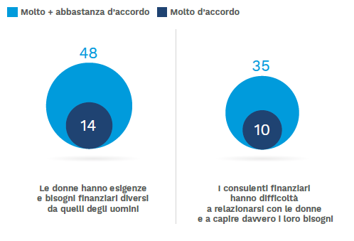 Le donne che ricevono la consulenza professionale si dicono soddisfatte, ma non soddisfattissime: solo una minoranza assegna al servizio un voto di eccellenza. Una donna su due pensa che le investitrici abbiano esigenze e necessità abbastanza diverse da quelle degli uomini.