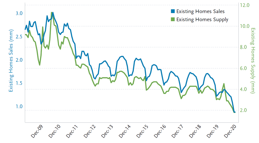 Secondo la National Association of Realtors, negli USA l’offerta di case esistenti è ai minimi storici, con 1,8 milioni di immobili sul mercato, mentre le vendite di case sono pari a 880.000 al mese. Ciò significa che vi sono poco più di due mesi di ‘scorte’ di case sul mercato: in altre parole, al ritmo attuale, se ipoteticamente non venissero messi in vendita nuovi immobili, ci vorrebbero solo poco più di due mesi per vendere ogni casa disponibile sul mercato.