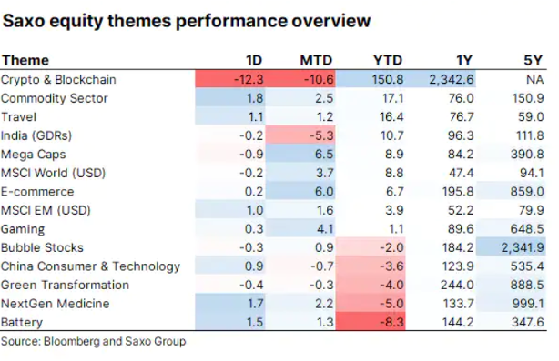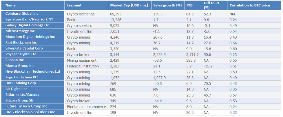 Con la quotazione di Coinbase, la dimensione e la maturità dell’industria delle criptovalute ha finalmente raggiunto un livello in cui possiamo introdurre un paniere di temi/titoli crittografici e blockchain. È il più piccolo composto fino ad oggi, con sole 18 società suddivise in segmenti come borsa di scambio, servizi di crittografia, mining di criptovalute, partecipazioni di investimento, applicazioni blockchain e apparecchiature di mining di criptovaluta.