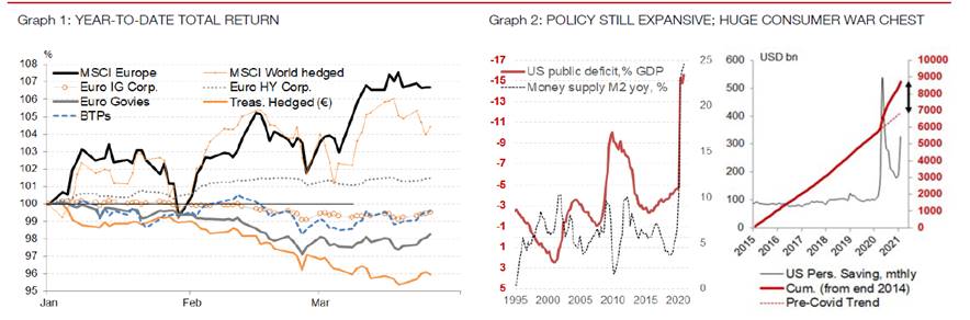 Dai dati non sembra ancora così, mentre l’Europa è alle prese con la terza ondata di infezioni,ma i mercati stanno procedendo rapidamente verso l’uscita dalla crisi Covid. Troppo veloce? Non riteniamo sia così e vediamo spazio per un’ulteriore rotazione. La fine dell’anno aveva già visto una solida performance degli asset ciclici, con gli investitori posizionatisi nella direzione di una forte ripresa economica. La rotazione si è amplificata nel primo trimestre 2021, con gli attivi meno rischiosi che hanno subito un colpo, in particolare i Treasury USA.