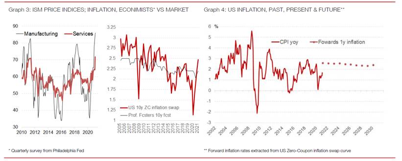 Non c’è dubbio che l’inflazione aumenterà in primavera, con quella basata sull’indice dei prezzi al consumo (CPI) destinata a salire ben al di sopra del 3,0% negli USA anno su anno. Allo stesso modo, nell’area euro, l’indice CPI core è già balzato dallo 0,4% all’1,1%. Tali pressioni sono essenzialmente transitorie e tecniche, nell’ambito di un forte rimbalzo dei prezzi delle materie prime, carenze di approvigionamento nel settore manifatturiero (ad esempio semiconduttori o microchip) e interruzioni dell’offerta nei servizi. Eppure gli investitori stanno iniziando a interrogarsi sulle prospettive di inflazione a medio termine, ancor di più negli Stati Uniti.
