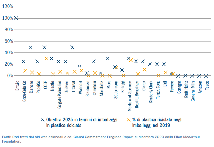 Infine, ma non in ordine d’importanza, una delle aree più promettenti è quella che si prefigge di rendere la plastica più circolare aumentando la riciclabilità degli imballaggi e l’uso di plastica riciclata. Gran parte degli sforzi viene convogliata sul raggiungimento di obiettivi volontari o normativi, che spesso si concentrano sulla riciclabilità al 100% e sulla percentuale di materiali riciclati del 25% entro il 2025. I progressi su questi fronti variano ma sono accomunati da una generale lentezza. Tra i produttori di beni di consumo e i confezionatori che aderiscono al Global Commitment on Plastics della Ellen MacArthur Foundation, solo il 6,2% dei volumi di plastica (in base al peso) è provenuto da fonti riciclabili nel 2019. A ciò si aggiunge il fatto che alcune aziende non hanno ancora fissato obiettivi specifici per quanto riguarda gli imballaggi in plastica. La Figura 2 mostra i progressi disomogenei compiuti da alcuni produttori di beni di consumo e la distanza dagli obiettivi del 2025.