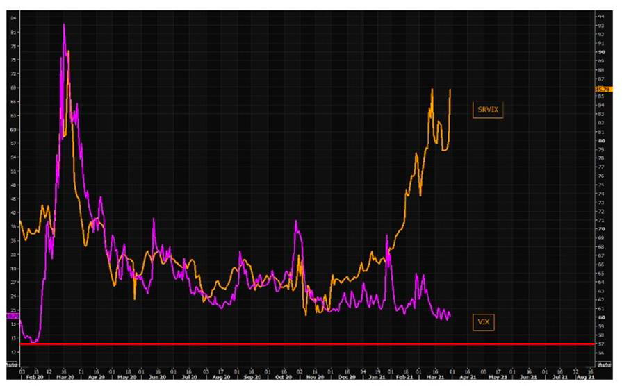 Da un lato, abbiamo il Cboe Interest Rate Swap Volatility Index (in arancione: SRVIX), ovvero un indice che fornisce una misura standardizzata della volatilità rilevata nel mercato OTC (Over-The Counter) degli swap sui tassi di interesse USA, ovvero una stima di riferimento per il comparto obbligazionario statunitense. Ebbene, segnaliamo come l’indice abbia registrato una crescita significativa da inizio anno al 31 Marzo, con un +35% circa, e dal grafico possiamo osservare addirittura che si sta avvicinando ai livelli massimi toccati in Marzo 2020, allo scoppio della pandemia.
