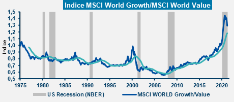 Detto ciò, crediamo che sarà necessario privilegiare gradualmente un approccio attivo per sfruttare al meglio la grande rotazione verso il value. Ci sono molti argomenti a lungo termine in favore dei titoli value: il loro essere fortemente scontati, la futura accelerazione dell’inflazione, il ritorno alla crescita (guadagni di produttività e investimenti nella decarbonizzazione, un fattore demografico meno sfavorevole fra alcuni anni ecc.). Ciò nonostante, è probabile che il percorso non sia affatto lineare. Da questo punto di vista notiamo che quando l’indice MSCI World Growth/Value scende al di sotto della sua media a 24 mesi, tende poi a rimbalzare (si veda il grafico), a volte persino violentemente. Rompere un ordine prestabilito può richiedere del tempo. Se crediamo che ci sia ancora un margine di circa il 10% prima che l’indice raggiunga la sua media, potremmo arrivare a un punto di caduta che supporterà la necessità di una gestione attiva per uscirne indenni.