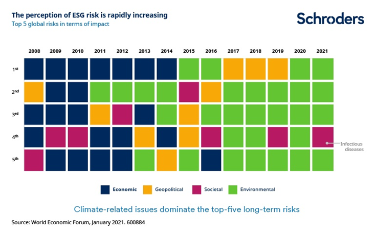 Secondo i dati del World Economic Forum, le persone stanno diventando sempre più consapevoli dei rischi ESG. Negli ultimi 14 anni (dalla crisi finanziaria in poi), i primi cinque rischi di lungo termine sono passati da essere economici a essere quasi esclusivamente ambientali.