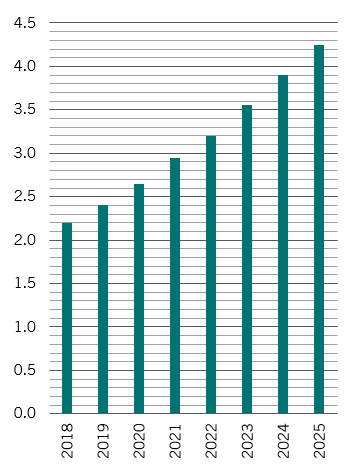 Il secondo passo consiste nel rendere gli edifici più ecologici. È qui che gli investitori immobiliari attivi possono essere coinvolti e, per estensione, capitalizzare a partire da un’opportunità di investimento sostenibile. Come per tutti gli immobili, la posizione è fondamentale. Per i data center non si tratta tanto di collegamenti di trasporto o di affluenza di pubblico, quanto di condizioni climatiche: i climi freddi contribuiscono a ridurre il consumo di energia, gran parte del quale viene solitamente speso per raffreddare le macchine. Non è un caso che l’investimento nei data center nei Paesi nordici sia quasi raddoppiato tra il 2018 e il 2025 (si veda il grafico). Di fondamentale importanza è anche il fatto che la regione sia dotata di reti in fibra ottica ultraveloci, le autostrade del mondo digitale, che utilizzano cavi costituiti da fili di fibra di vetro sui quali i dati vengono trasferiti sotto forma di luce ottica.