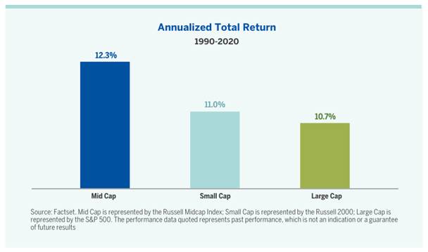 Ecco un indovinello per voi: cosa cresce più velocemente nella mezza età che in gioventù? Crediamo che la risposta siano le azioni a media capitalizzazione. Storicamente, le società mid-cap hanno prodotto risultati invidiabili rispetto alle società più giovani small-cap (cosìcome le società a larga capitalizzazione più mature).