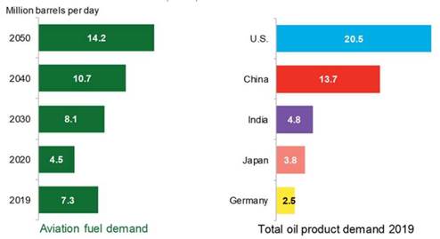 Un settore che consuma enormi quantità di risorse naturali, ma che a nostro avviso presenta l’opportunità di un cambiamento realistico, è l’aviazione. Riuscire a ridurre le emissioni sarebbe una grande vittoria. Nel 2019 il settore ha generato l’8% del consumo totale di petrolio, equivalente a quasi 7,5 milioni di barili al giorno. Nel 2020 il Covid-19 ha lasciato a terra la maggior parte delle flotte delle compagnie aeree, riducendo del 39% il consumo di carburante, ma la propensione per i viaggi aerei è destinata probabilmente a crescere nel lungo periodo, vista l’importanza della mobilità. Senza un intervento normativo, tuttavia, gli aerei continueranno a usare combustibili fossili, e si stima che entro il 2050 il settore potrebbe assorbire oltre 14 milioni di barili al giorno, più di quanti ne abbia consumati la Cina nel 2019 (Figura 1).