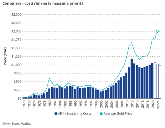 In questo ciclo, le società sono molto più efficienti nel controllare i costi di quanto non siamo mai state prima. Il grafico seguente sugli AISC mostra l’andamento storico dei costi rispetto alla quotazione dell’oro. Si noti che i costi sono rimasti intorno a 1.000 dollari quando, nel 2020, il prezzo dell’oro è salito a oltre 2.000 dollari. Secondo stime di Scotia i costi subiranno una leggera flessione fino al 2023.