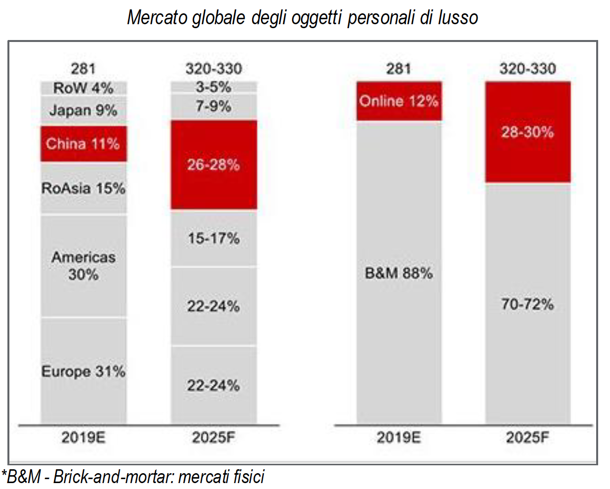 Infatti, con una buona probabilità, il ritorno ai livelli del 2019 potrebbe avvenire già nel 2021, con il controvalore del mercato globale stimato tra i 280 ed i 295 miliardi di euro. Inoltre, ci si attende una crescita significativa anche per gli anni a venire, con la possibilità che possano delinearsi dei cambiamenti sostanziali della composizione del mercato. Come si può osservare dal grafico sopra rappresentato, infatti, abbiamo due grandi driver che incideranno sulla crescita del settore del lusso. Da un lato, abbiamo la Cina: i consumatori del colosso asiatico, stando ai dati stimati per il 2019, pesano per poco più del 10% su base globale, ma entro il 2025 potrebbero rappresentare fino al 28% circa del mercato. Oltre alla situazione epidemiologica, che ha favorito lo sviluppo del mercato interno cinese, pesano anche altri trend, come il “rimpatrio” dei consumi favorito dalla riduzione dei dazi nel 2015 e l’armonizzazione dei prezzi internazionali. Dall’altro lato, invece, abbiamo una tendenza che ha visto un’accelerazione importante con la pandemia, ovvero il digitale. Dalle rilevazioni del 2019 gli acquisti online rappresentano circa l’11%, mentre per il 2025 la quota potrebbe raggiungere il tetto del 30%. La forza dell’E-Commerce, inoltre, sta permettendo anche la crescita di un fenomeno promettente e attento ai temi della sostenibilità, ovvero quello del reselling: ad oggi i principali player internazionali, come ad esempio Kering, stanno implementando investimenti importanti per generare nuovi cash flows. Il grande conglomerato, in particolare, lo scorso Marzo ha guidato un round di finanziamento di $ 216 milioni a favore del sito di rivendita di beni di lusso francese Vestiaire Collective, una piattaforma che nel 2020 ha aumentato le sue entrate di oltre il 100%.