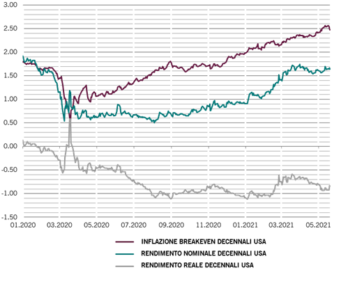 L’aumento dei rendimenti statunitensi nel 2020 è stato in gran parte trainato da un aumento dei tassi di breakeven, in un momento in cui i tassi reali rimanevano profondamente negativi per tutte le scadenze dei Treasury USA (ossia lungo tutta la curva dei rendimenti), cosa che non dispiaceva ai banchieri della Federal Reserve. I rendimenti reali negativi, infatti, sostengono l’economia, mentre l’aumento dei tassi di breakeven faceva presagire un rialzo dell’inflazione, fatte salve le precisazioni di cui sopra. Un aumento dell’inflazione, inoltre, implica il restringimento del divario tra la crescita potenziale dell’economia e il tasso di crescita effettivo, all’epoca nettamente inferiore al potenziale.
